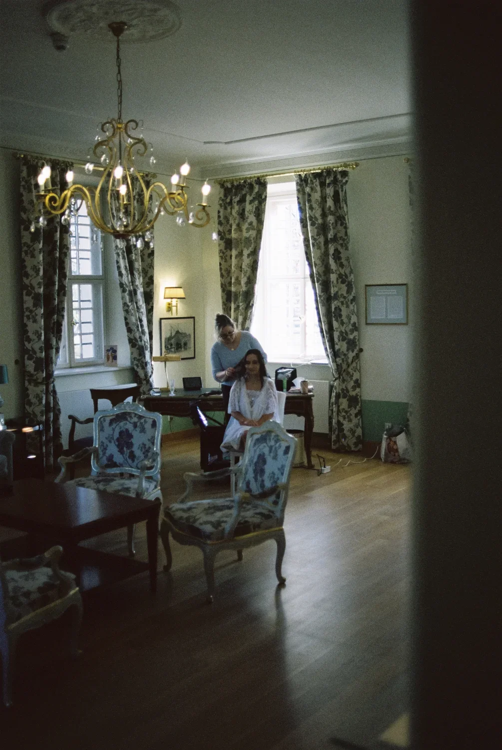 I don’t do "posed." I don't ask you to tilt your head or pretend to put on your shoes for the tenth time. My 35mm cameras are there to witness, not to direct. When Munira sat in that grand room with the chandelier, it wasn’t a "bride portrait"—it was a quiet moment of anticipation.